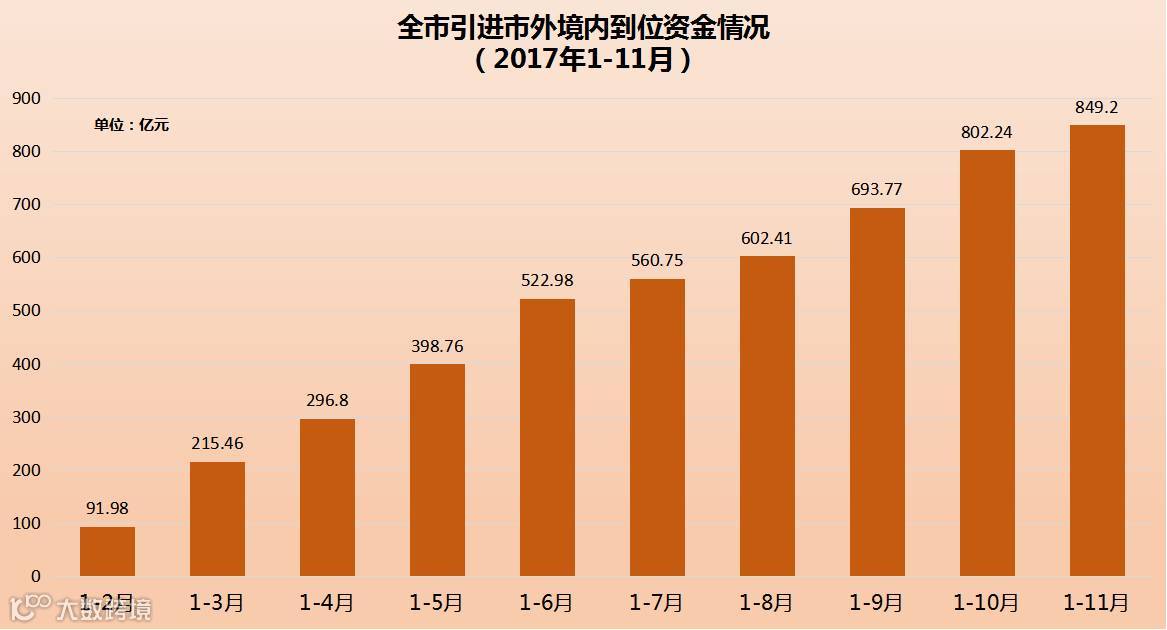 1-11月,全市引进市外境内到位资金(含续建项目)849.2亿元,同比增长9.22%,完成市政府下达市外境内年度目标任务750亿元的113.23%;其中区外境内到位资金737.8亿元,同比增长6.88%,完成市政府下达区外境内年度目标任务665亿元的110.95%;