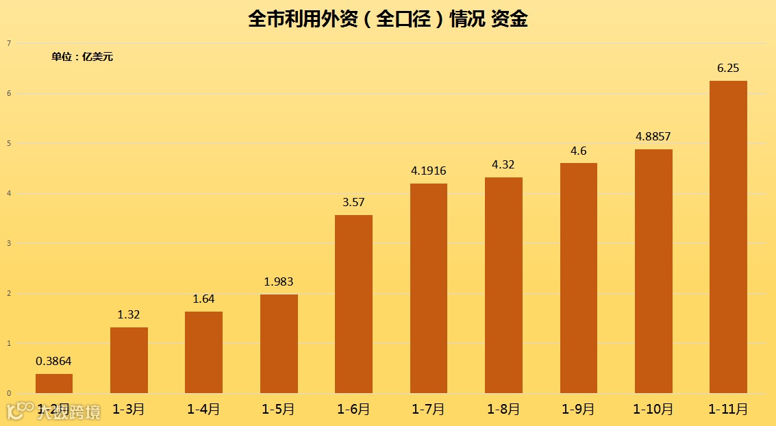 1-11月,全市全口径利用外资(含商务口径)6.25亿美元,完成市政府下达年度目标任务5.2亿美元的120.19%,同比增长14.05%。