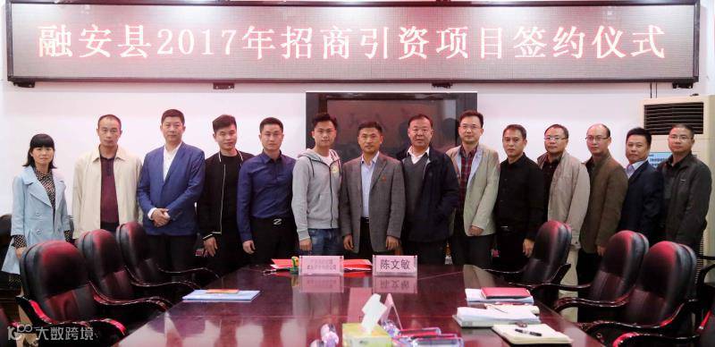 11月6日,融安县召开2017年招商引资项目签约仪式,签约项目3个,总投资4.8亿元。县委副书记、县长陈文敏,广西我的庄园农业开发有限公司执行经理莫明友,广西霸普环保科技有限公司和广西壮象木业有限公司董事长叶新忠等出席签约仪式,县委常委、副县长覃建飞主持仪式。