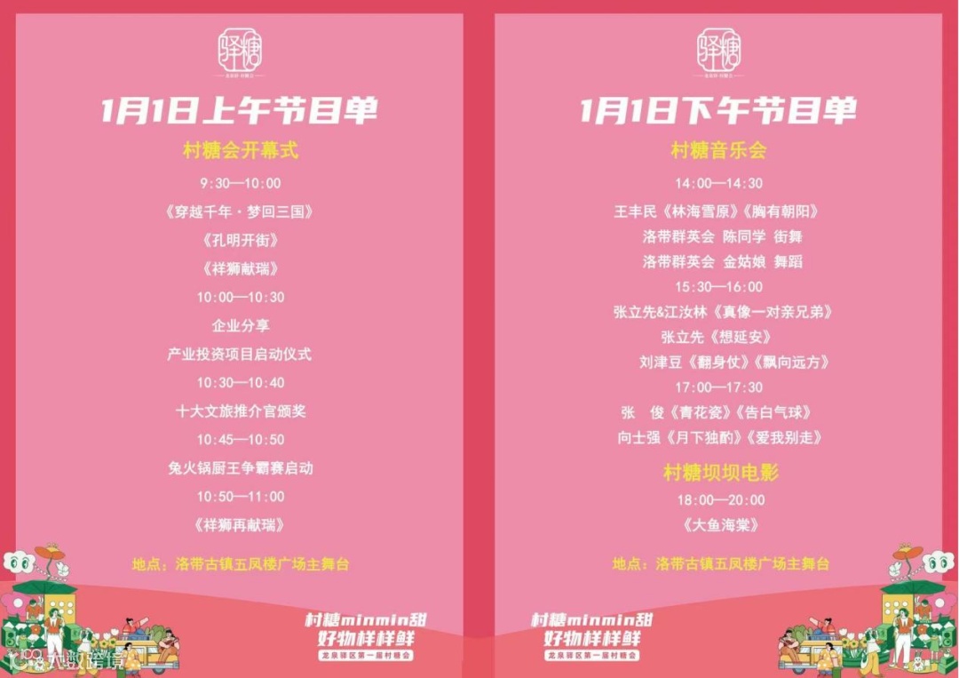 1月1日14:00—17:30村糖音乐会,经典与流行歌曲轮番演绎,穿插精彩舞蹈。