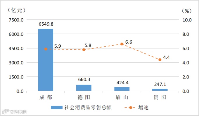 1—7月,成都都市圈社会消费品零售总额7881.6亿元,同比增长5.9%,占全省比重为47.7%。其中,成都市社会消费品零售总额6549.8亿元,增长5.9%,占成德眉资四市比重为83.1%;德阳市、眉山市、资阳市社会消费品零售总额分别为660.3亿元、424.4亿元、247.1亿元,分别增长5.8%、6.6%、4.4%。