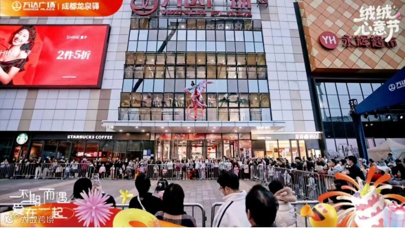 当赛事与庆典相遇,是激情与荣耀的交汇。赛事举办之际,适逢龙泉驿万达广场“7周年庆”。为吸引客流,万达广场同步设置电竞观赛点。而在这场“生日庆典”上,首届曲艺文化节古彩戏法与相声板块燃情开演,敦煌飞天秀让电竞文化与国潮文化共舞,带给游客们耳目一新的消费体验。