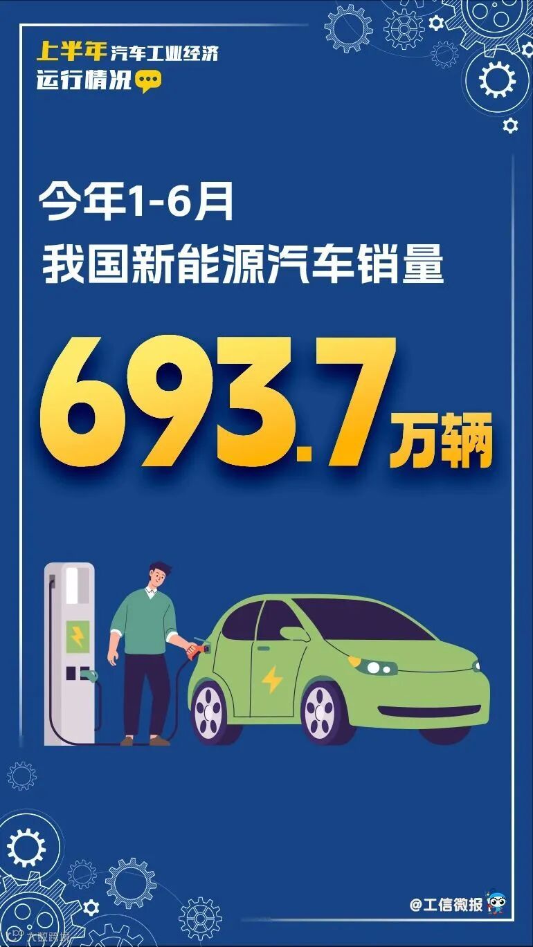 1—6月,新能源汽车产销分别完成696.8万辆和693.7万辆,同比分别增长41.4%和40.3%;新能源汽车新车销量达到汽车新车总销量的44.3%。