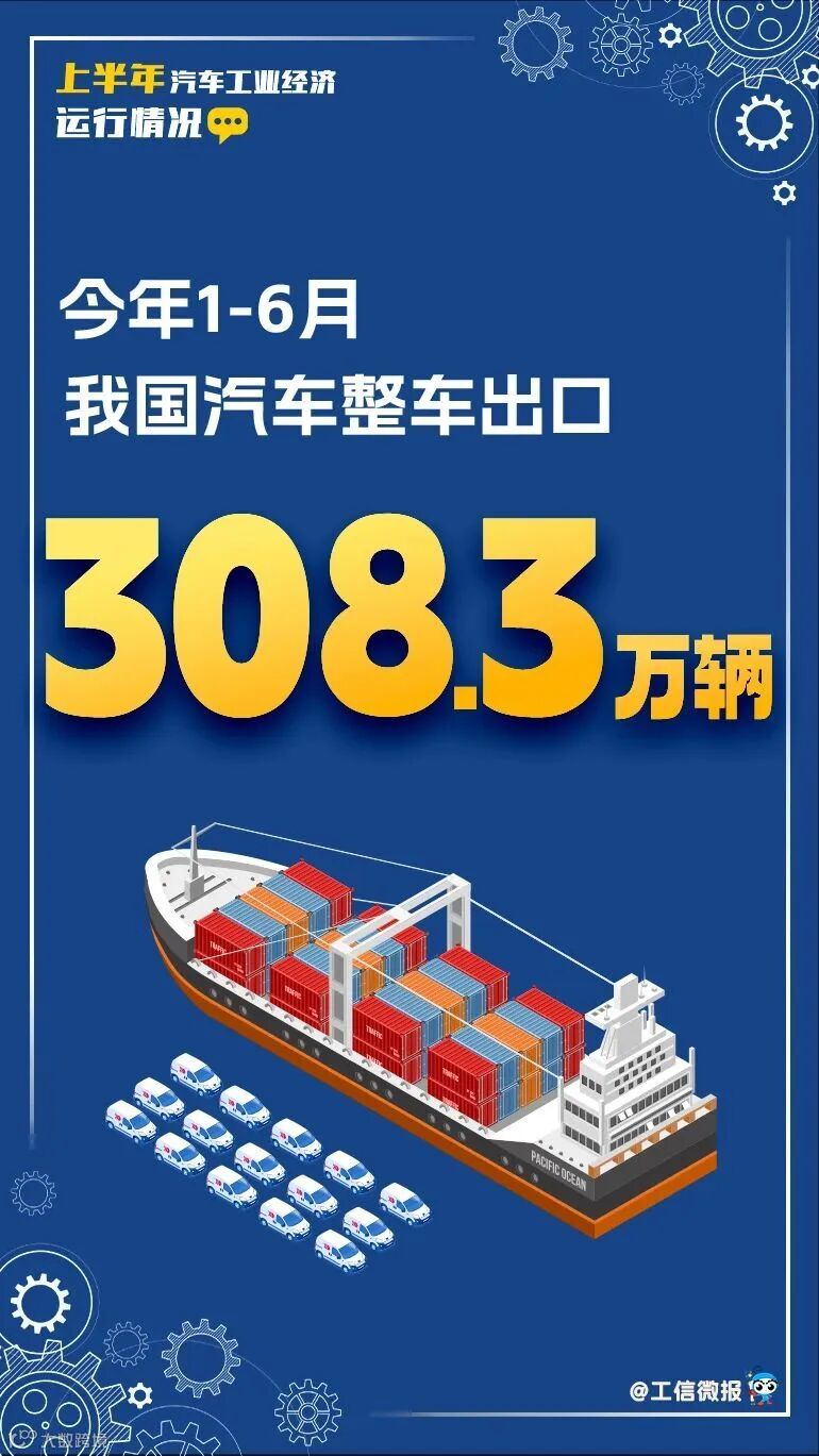 1—6月,汽车整车出口308.3万辆,同比增长10.4%。新能源汽车出口106万辆,同比增长75.2%。