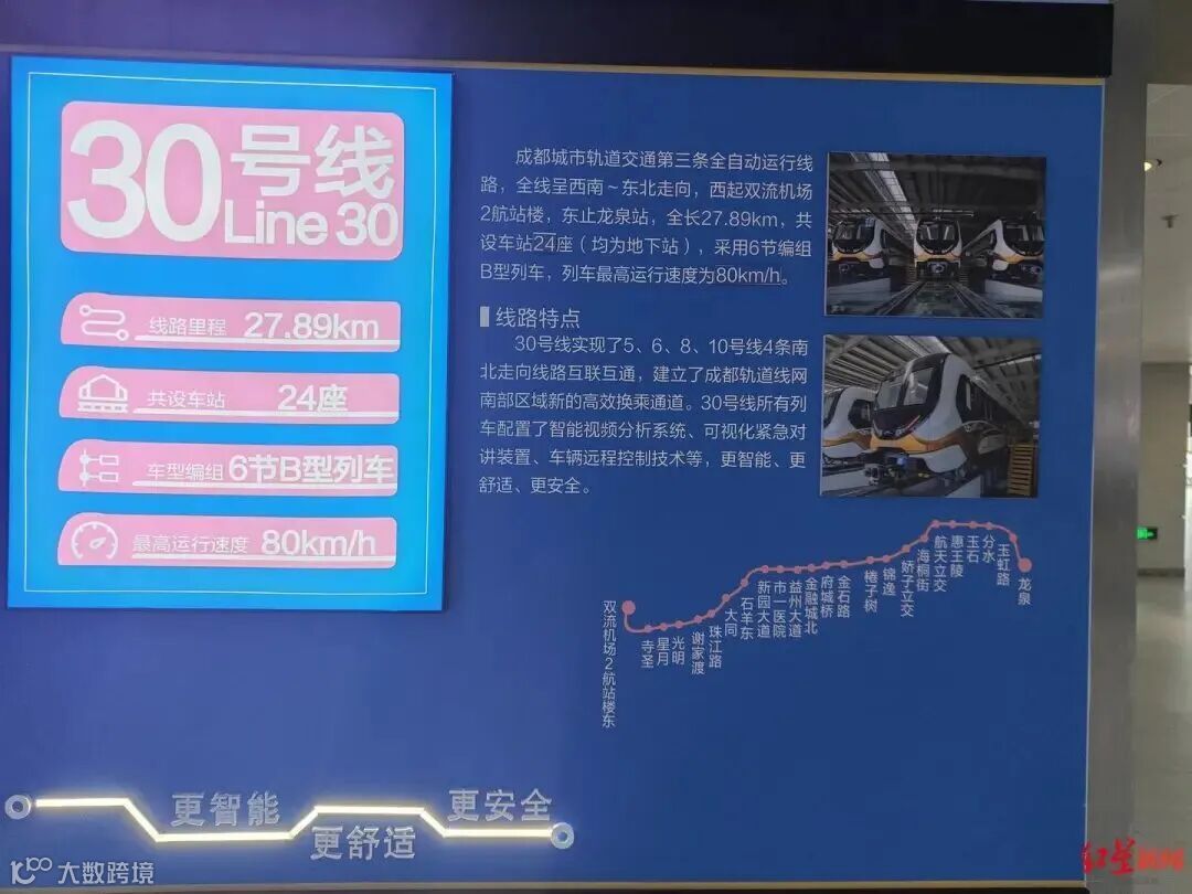经实测,30号线一期的追踪间隔和折返时间相比传统系统都有所缩短,这能让列车跑得更密、跟得更近,目前30号线高峰期能同时上线25列车,从龙泉驿火车站南站到双流机场2航站楼东站运行时间仅46分钟。