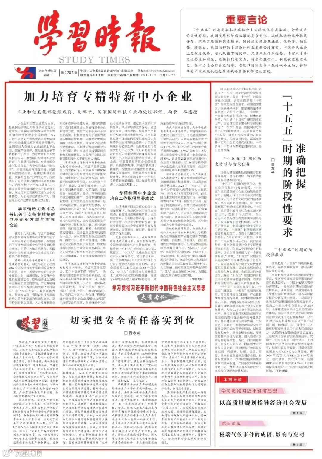 牢牢把握支持专精特新中小企业发展的主要任务。习近平总书记强调,要支持引导行业领军企业和掌握关键核心技术的专精特新企业深化改革、强化创新,加大培育力度;要开展补链强链专项行动,加快解决“卡脖子”难题,发展专精特新中小企业;要加快新能源、人工智能、生物制造、绿色低碳、量子计算等前沿技术研发和应用推广,支持专精特新企业发展。自主创新是企业的生命,是企业爬坡过坎、发展壮大的根本。专精特新中小企业积极布局新兴产业和未来产业,瞄准人工智能等前沿领域,发挥机制灵活、技术创新优势,抢占科技制高点,成为发展新质生产力的中坚力量和强劲引擎。新时代新征程,我们要完整、准确、全面贯彻新发展理念,坚持创新是引领发展的第一动力,深入实施创新驱动发展战略,搭建平台、健全体制机制,不断强化企业科技创新主体地位,加快推进科技创新与产业创新深度融合,坚定支持更多专精特新中小企业脱颖而出、持续涌现,在新领域新赛道跑出加速度。