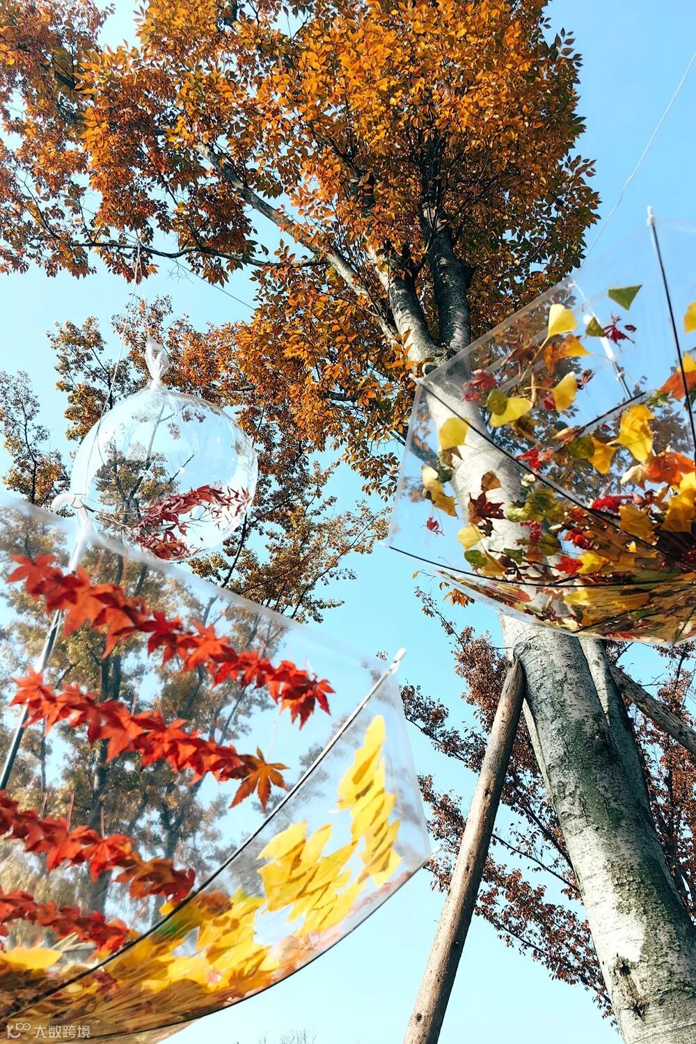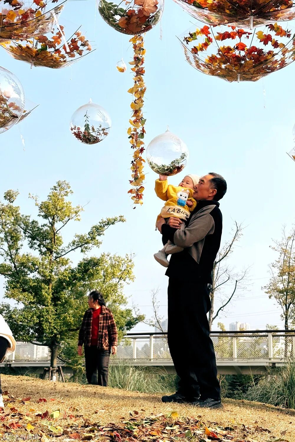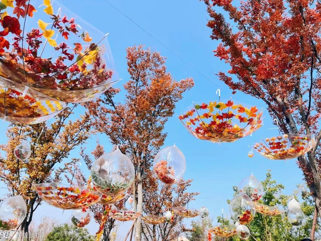 以落叶为素材,打造“秋收透明桶”“落叶风铃”等互动装置,市民可亲手拾叶创作,在透明雨伞与气球构成的童话场景中重拾童趣。