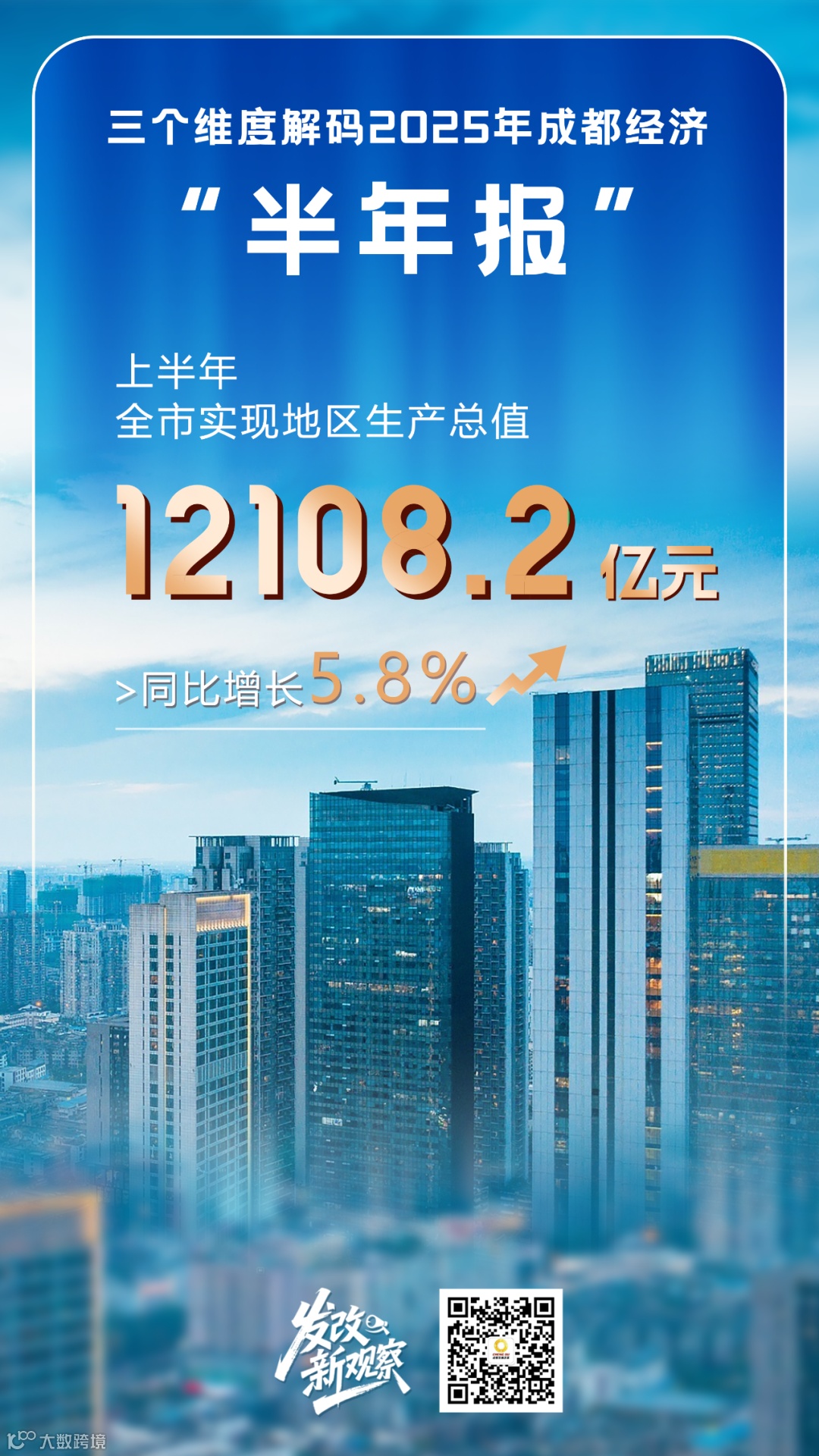 近日,2025年成都经济“半年报”出炉。统计数据显示,上半年全市实现地区生产总值12108.2亿元,同比增长5.8%。