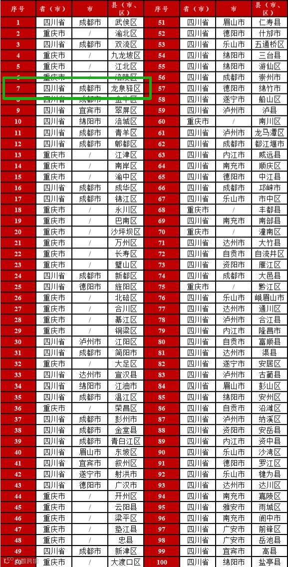 8月11日,四川赛迪研究院与重庆赛迪研究院联合发布《成渝地区双城经济圈高质量发展研究报告(2025)》。报告包含了成渝地区双城经济圈高质量发展指数前100区县名单,重庆有29个县(区)入围,成都有19个县(市、区)入围。其中,成都龙泉驿区位列百强区县第7位。