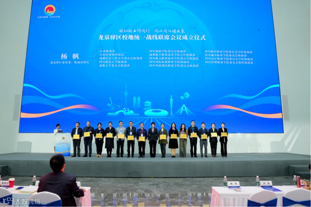 龙泉驿区委常委、统战部部长杨帆为成都大学、四川师范大学等12所高校以及区委统战部和区新经济和科技局授牌,标志着龙泉驿区校地统一战线联席会正式成立。