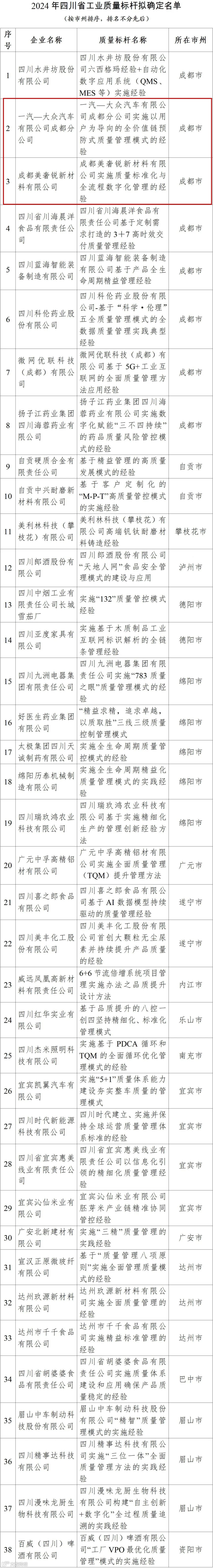 2024年四川省工业质量标杆拟确定名单