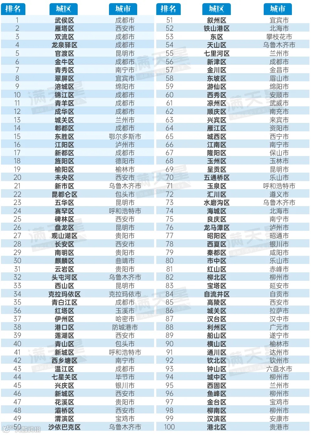 四川上榜的29个区分别是成都市武侯区、成都市双流区、成都市龙泉驿区、成都市金牛区、宜宾市翠屏区、绵阳市涪城区、成都市锦江区、成都市青羊区、成都市成华区、成都市郫都区、泸州市江阳区、成都市新都区、德阳市旌阳区、成都市青白江区、成都市温江区、宜宾市叙州区、攀枝花市东区、成都市新津区、眉山市东坡区、绵阳市游仙区、南充市顺庆区、资阳市雁江区、乐山市五通桥区、泸州市龙马潭区、乐山市市中区、自贡市自流井区、广元市利州区、遂宁市船山区、达州市通川区,其中有15个区排名在前50名。