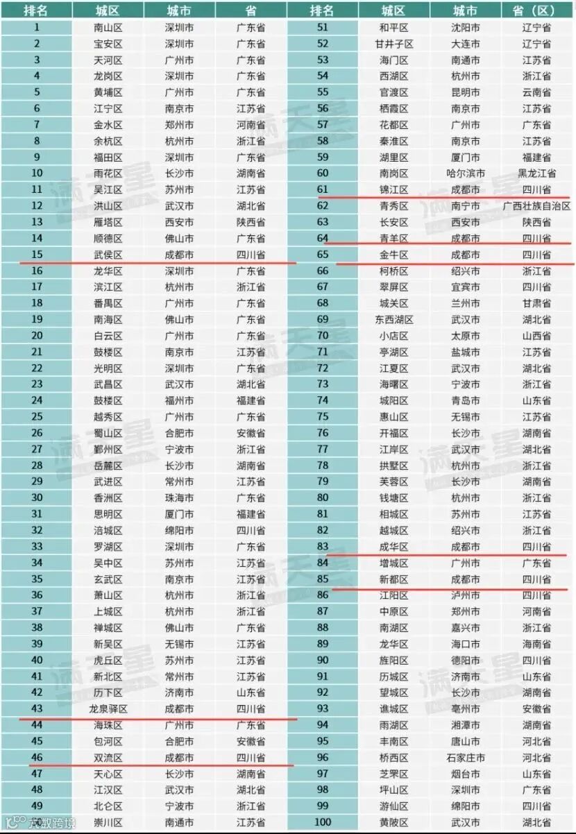 分区域来看,广东、江苏、浙江、四川为第一梯队,占总数的六成以上。广东省相较去年增加2个上榜城区,在全国居领先地位。此外,湖北、湖南、山东、福建、安徽居第二梯队,上榜城区总数24个,陕西、辽宁、河南、河北、云南、山西、黑龙江、海南、广西、甘肃为第三梯队,上榜城区总数14个。