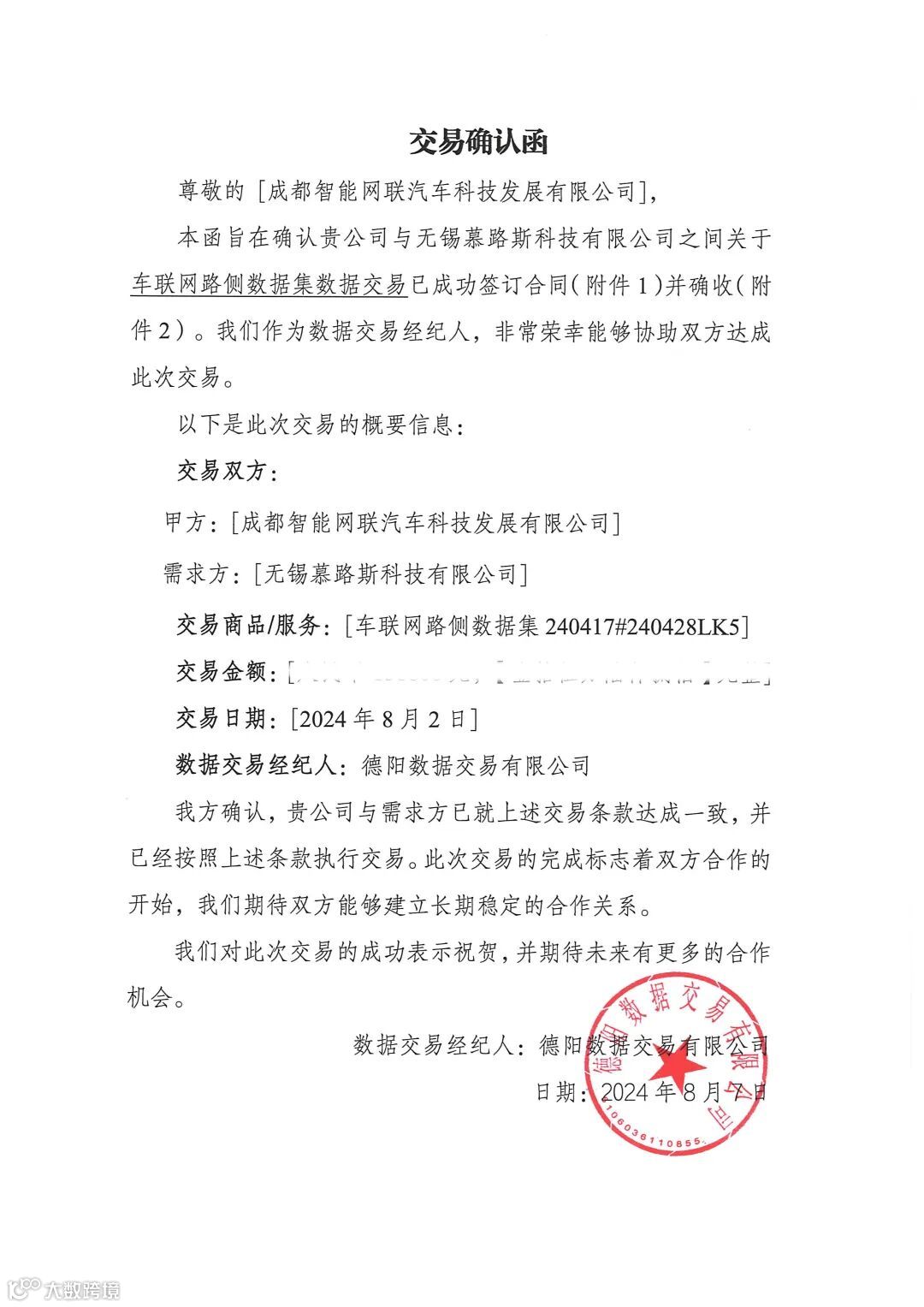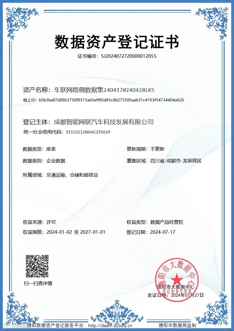 2024年8月7日,经开产投集团下属智能网联公司在德阳数据交易中心(四川地区唯一数据资产交易场所),完成含约1.1亿条脱敏数据的龙泉驿区车联网路侧数据集交易,实现全省首例城市区域车联网数据资产登记交易。