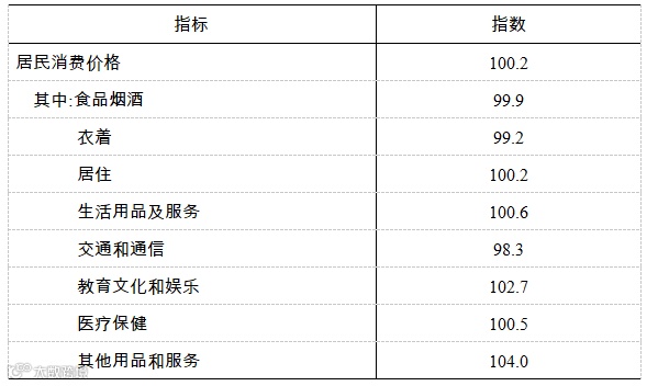 全年居民消费价格(CPI)比上年上涨0.2%,其中教育文化和娱乐类上涨2.7%,生活用品及服务类上涨0.6%,医疗保健类上涨0.5%,居住类上涨0.2%,食品烟酒类下降0.1%,衣着类下降0.8%,交通和通信类下降1.7%。