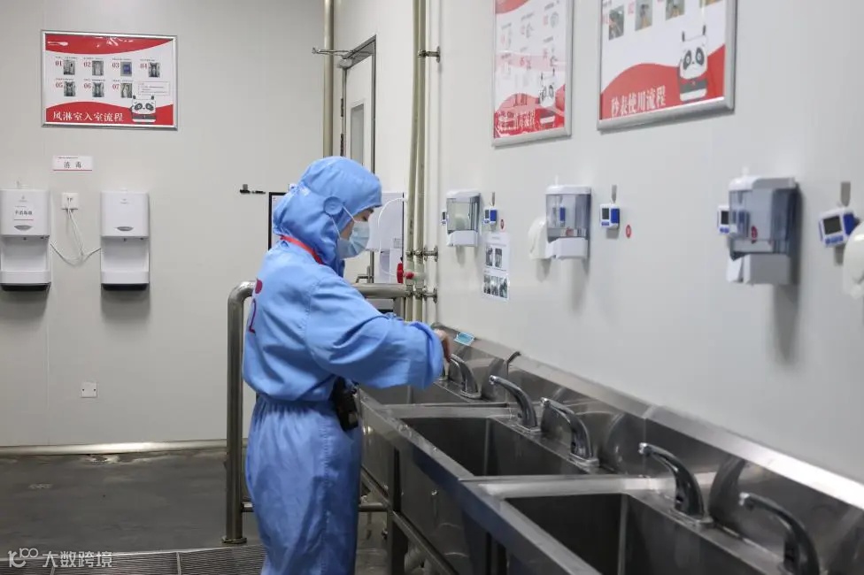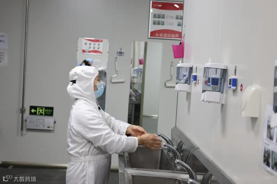 换上干净的拖鞋、填写健康表、通过安检门后来到一更衣室,不同清洁度要求的车间有独立的更衣室,换上专用头套、工作服,戴上口罩、再换上工作靴,穿戴完毕后还要从头到脚再次进行粘毛除尘处理,而这仅仅是入室清洁的开始。“请站到消毒池里对鞋底进行消毒,并按照洗手消毒‘七步法’流程图进行手部清洗和浸泡消毒30秒。洗消完毕后上池岸剐蹭掉鞋底附带的消毒水,再站到前面进行手部干燥、喷洒消毒酒精,最后还要通过风淋室,吹除可能遗留在工作服表面的毛发、尘埃等。”按照工作人员的指示,记者做完这一切后,终于全副武装地进入了工厂的生产车间。