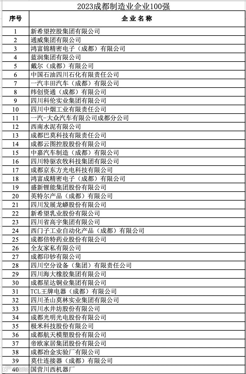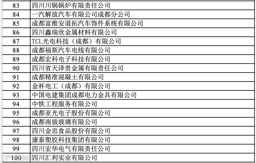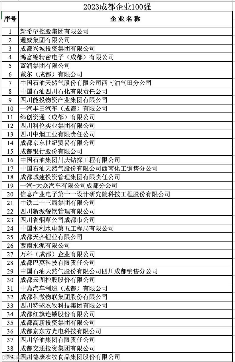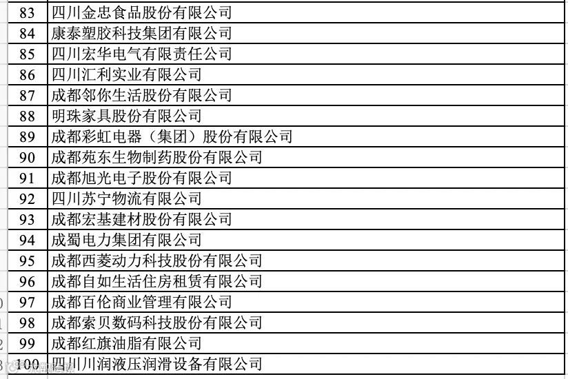 成都企业100强榜单