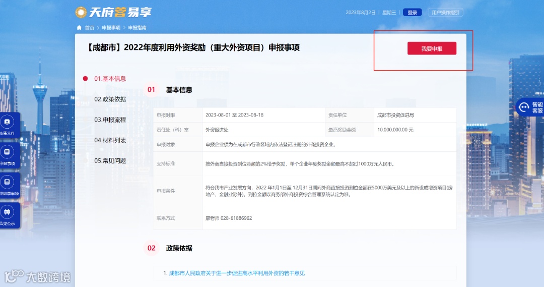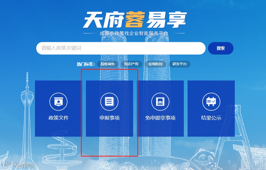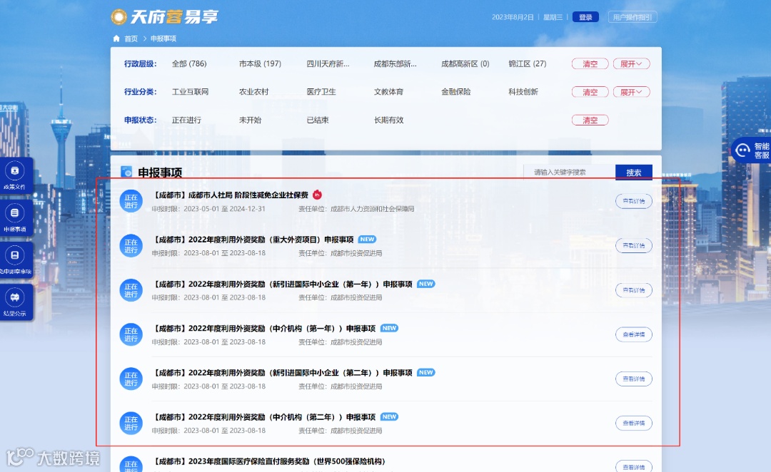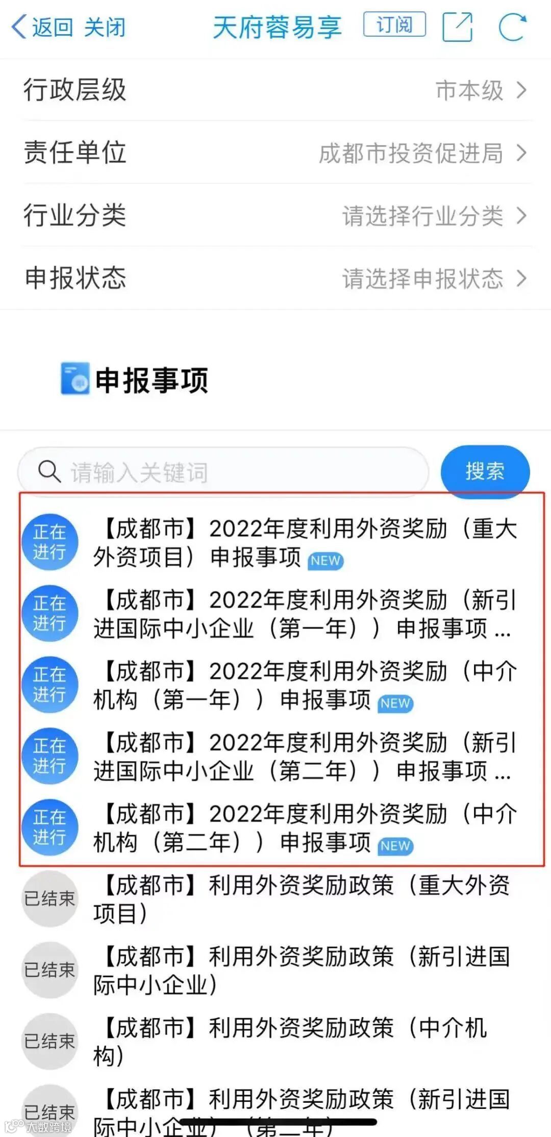 点击“申报事项”,进入事项列表,可点击“行政层级-市本级”,“责任单位-成都市投资促进局”,选择相应申报事项,进入申报指南。进入指南后,点击“我要申报”,按照页面引导,完成申报。