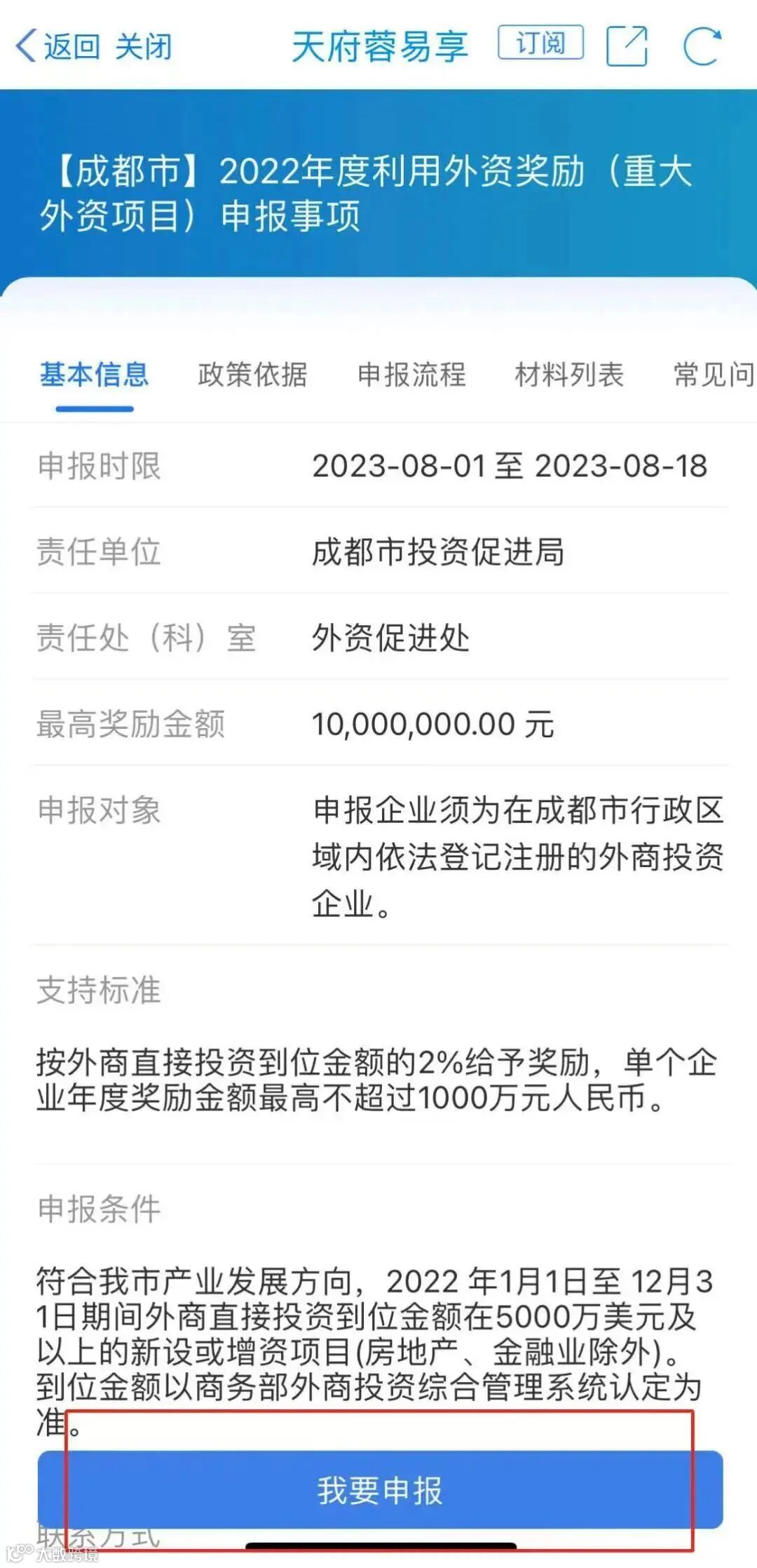 (一)重大外资项目。符合我市产业发展方向,2022年1月1日至12月31日期间外商直接投资到位金额在5000万美元及以上的新设或增资项目(房地产、金融业除外)。申报企业须在成都市行政区域内依法登记注册。