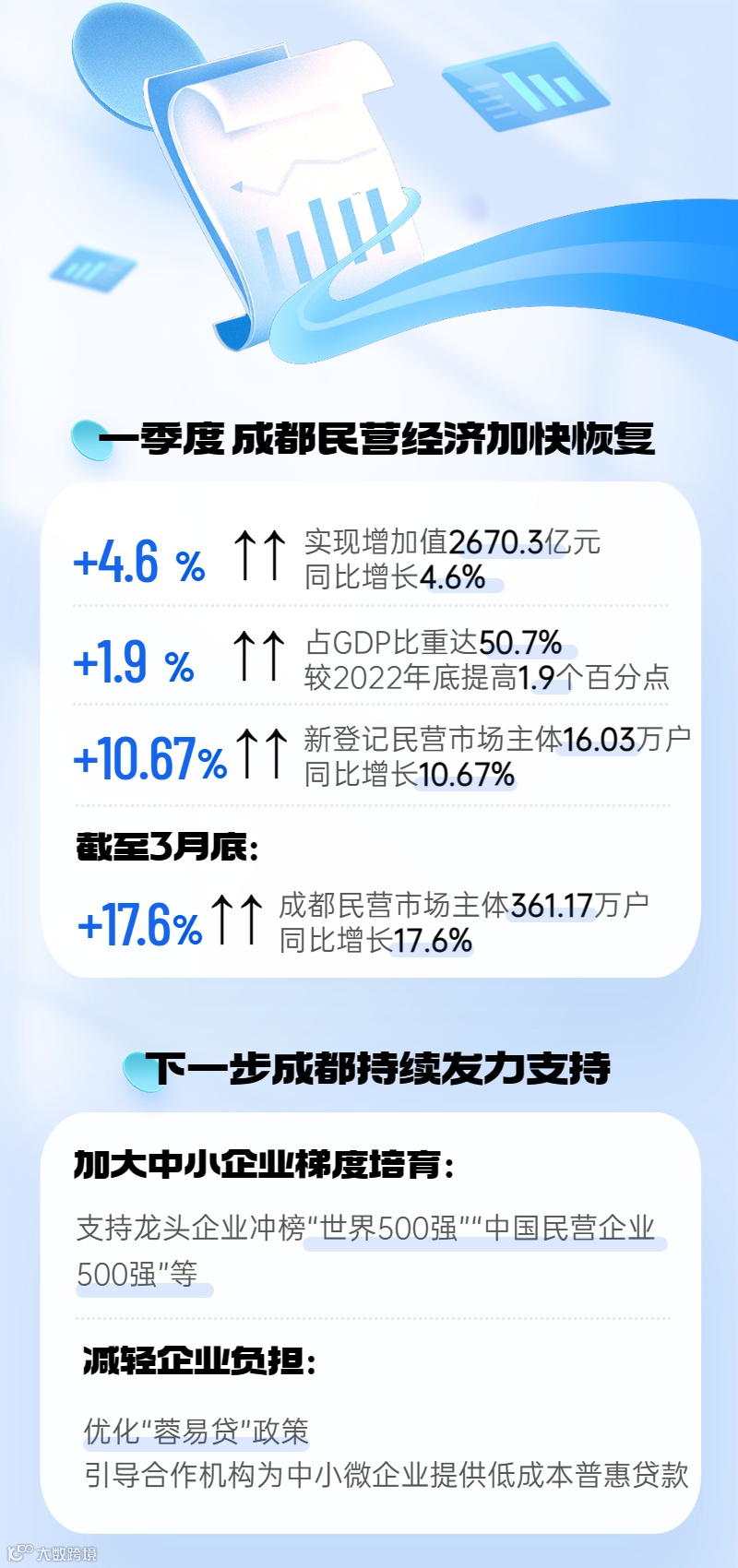 如今,成都民营企业活力迸发,民营经济实力持续壮大。2022年,全市实现民营经济增加值10156.84亿元,首次突破万亿元大关,占GDP的48.8%。今年一季度,全市民营经济实现增加值2670.3亿元、同比增长4.6%,占GDP比重提升至50.7%,民营经济呈现加快恢复发展的良好态势。