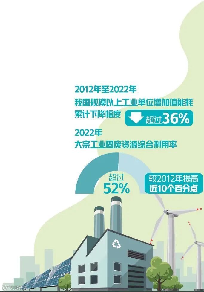 近年来,我国工业绿色发展取得明显成效。数据显示,2012年至2022年我国规模以上工业单位增加值能耗累计下降幅度超过36%;2022年大宗工业固废资源综合利用率超过52%,较2012年提高近10个百分点。