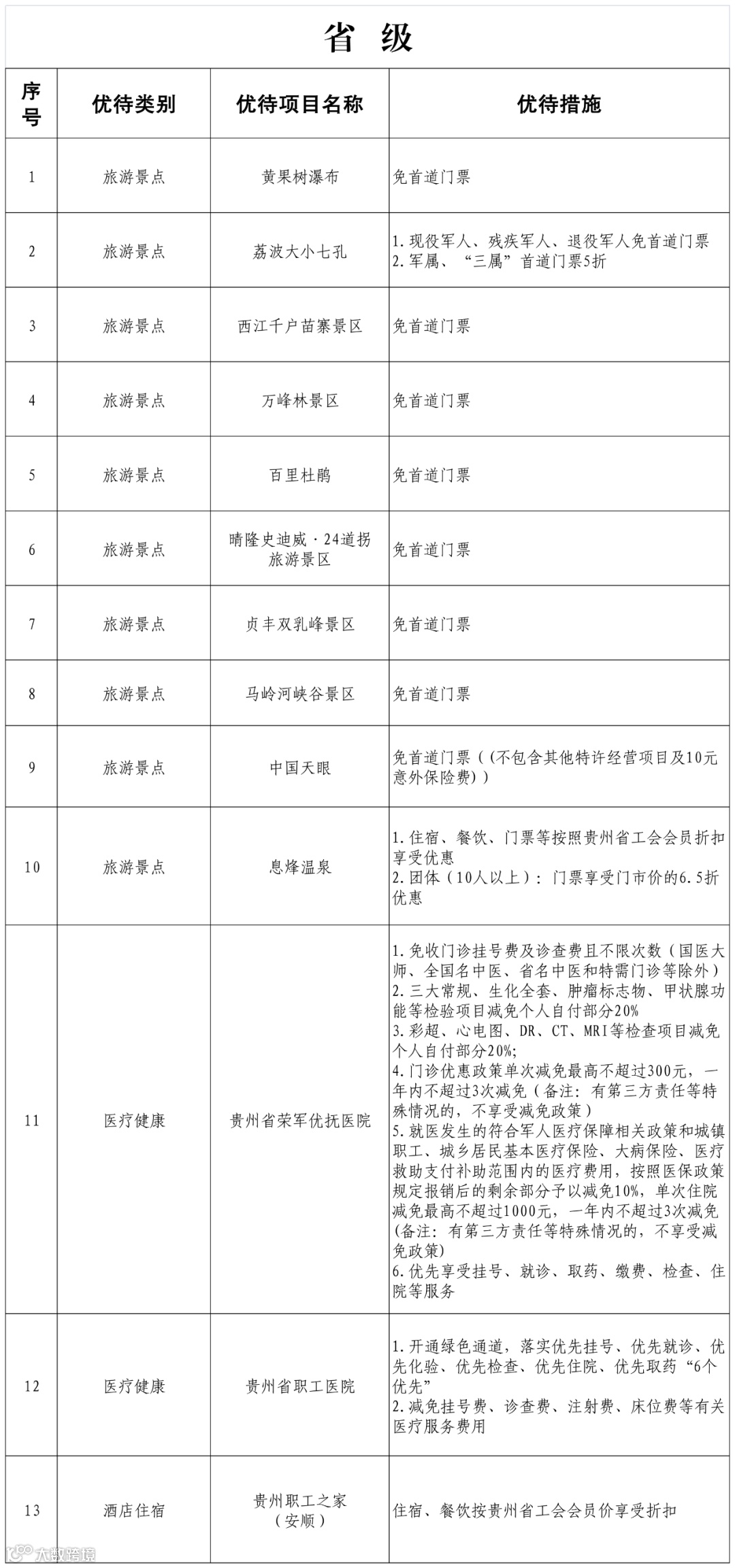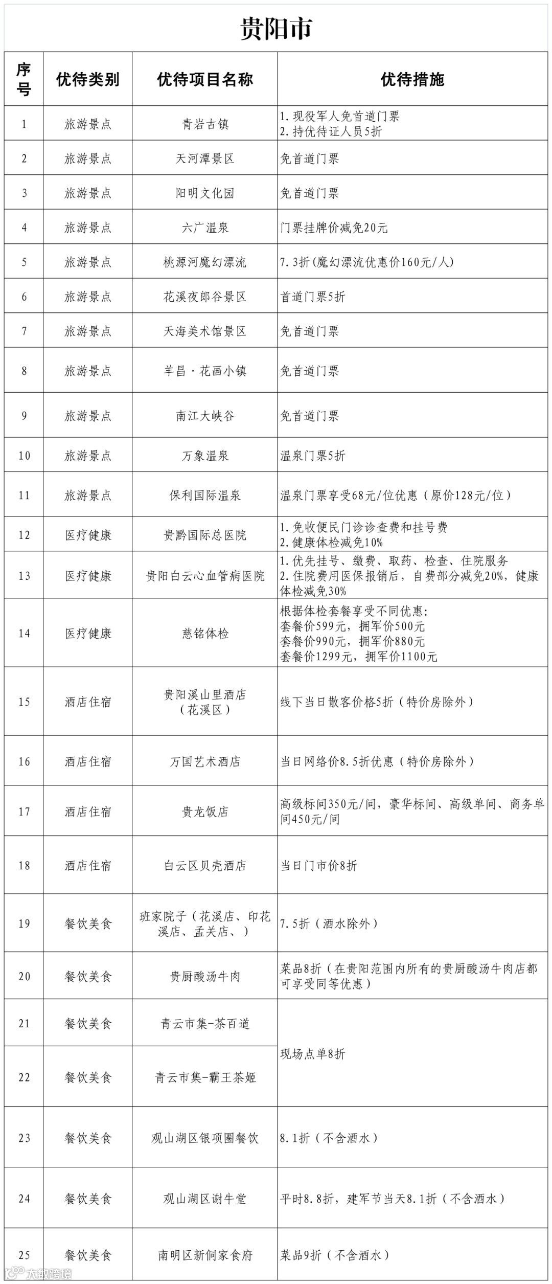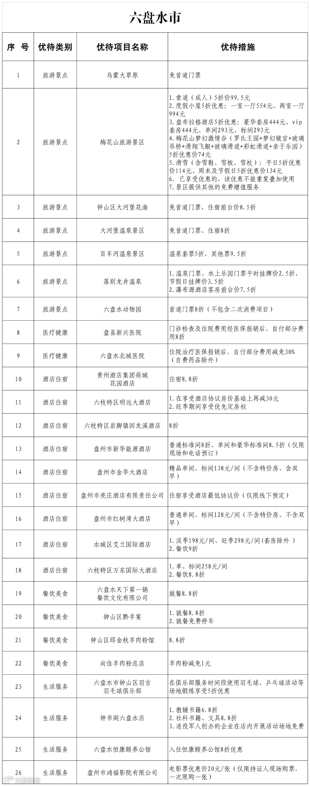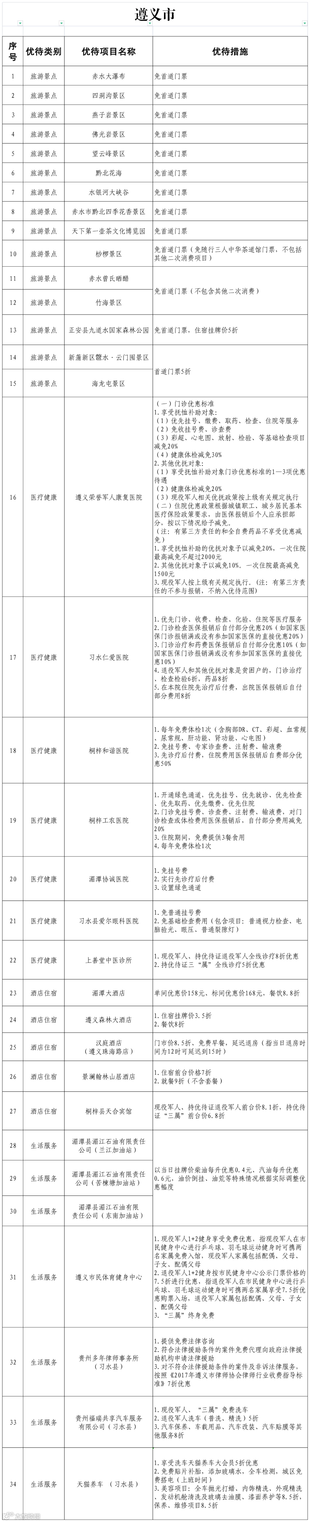 优待优惠项目清单