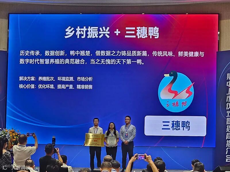 据了解,乡村振兴首批数据产品项目通过县域特色产业数据开发利用,打造乡村振兴特色数据产品,并在数据交易所上市及流通交易,在精准农业管理、市场趋势分析、产业链优化三个方面实现场景化应用,促进县域经济高质量发展,助力乡村振兴战略实施。此次,黔东南州三穗鸭系列产品的解决方案包括养殖批次、环境监测、市场分析三个方面,核心价值在于优化环境、提高产量、精准销售。在数据产品集中上市仪式上,三穗县获得了数据产品上市证书和上市牌匾 ,县有关代表上台参加敲锣仪式并签订《县域数字经济发展倡议书》,贵州金禾惠恒盛贸易有限公司与华南数字产业集团签订了上市服务协议。