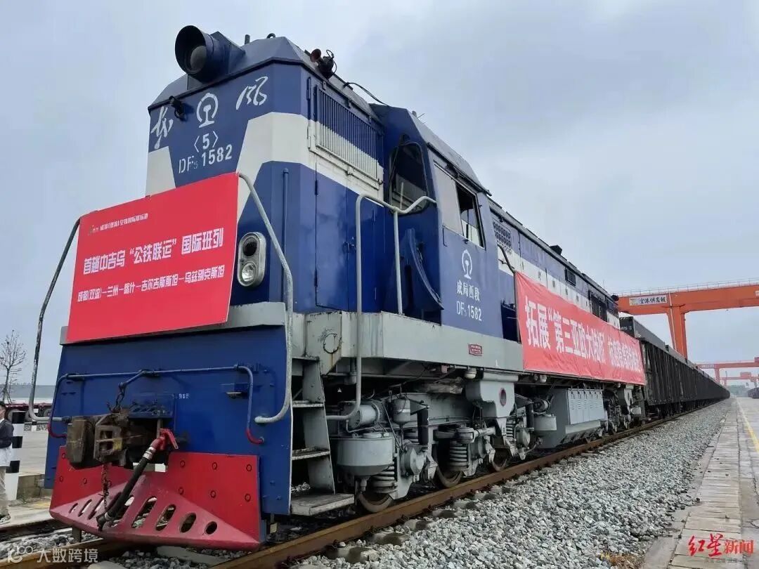 ▲首趟中吉乌“公铁联运”国际班列从成都驶出
