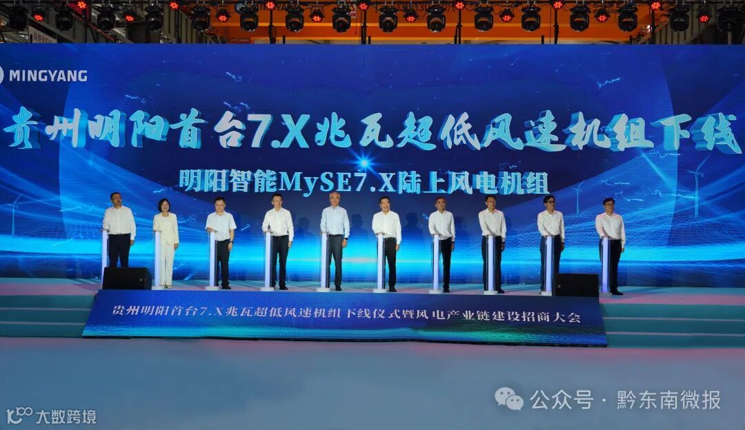 8月26日,贵州明阳首台7.X兆瓦超低风速机组下线仪式暨风电产业链建设招商大会在黔东南州丹寨县召开。副省长蔡朝林出席并见证项目签约。明阳集团党委书记、董事长张传卫出席。州委副书记、州长杨光杰,明阳集团高级副总裁、西南区域公司董事长张献中出席会议并致辞。副州长王建华主持。