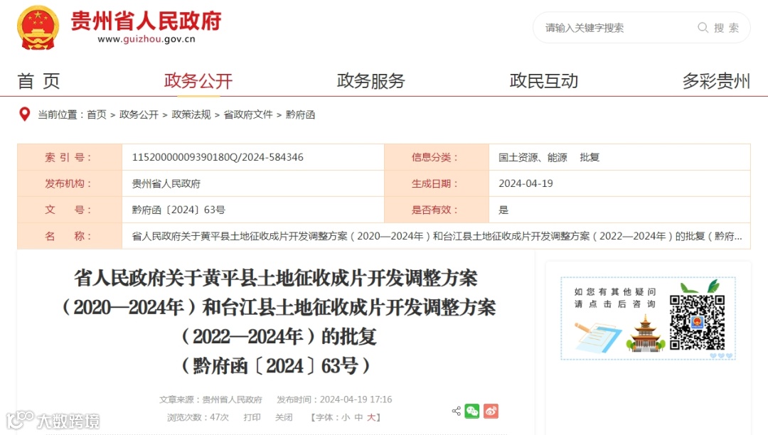 你州《关于报请批准黄平县和台江县土地征收成片开发调整方案的请示》(黔东南府呈〔2024〕53号)收悉。经研究,批复如下: