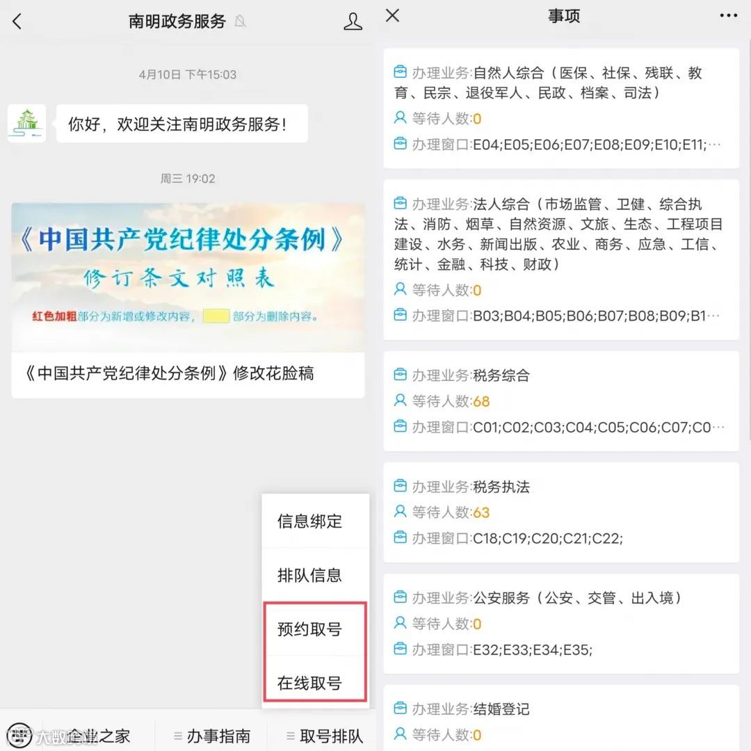 图为南明区政务服务微信公众号在线取号系统。