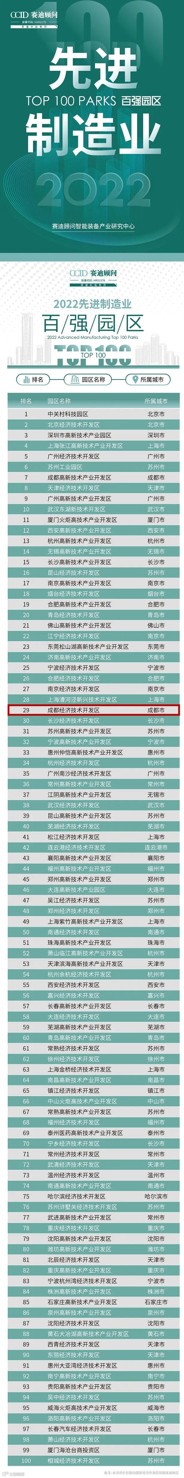 7月5日,赛迪顾问智能装备产业研究中心发布《先进制造业百强园区(2022)》榜单,成都经开区再次上榜,排名第29位,较2021年度排名上升8位。