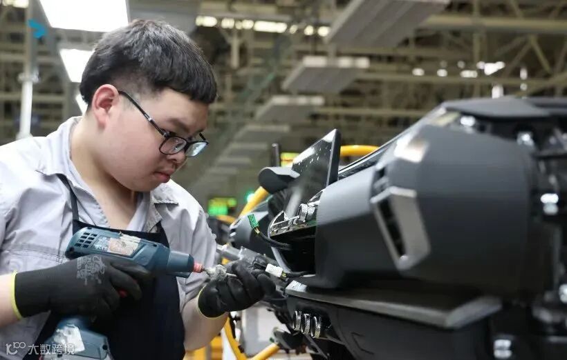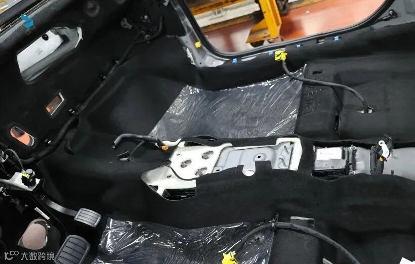 来到总装车间中控台组装区,可以看到环保搪塑内饰、环保隔音止震材料。