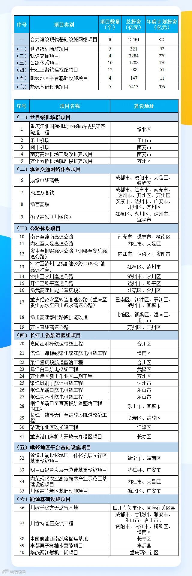 在合力建设现代基础设施网络方面:项目投资总量规模最大,涉及40个项目、总投资1.35万亿元,包括成渝中线高铁、川渝千亿方天然气基地等,一批交通、能源、毗邻平台基础设施项目将加快实施。