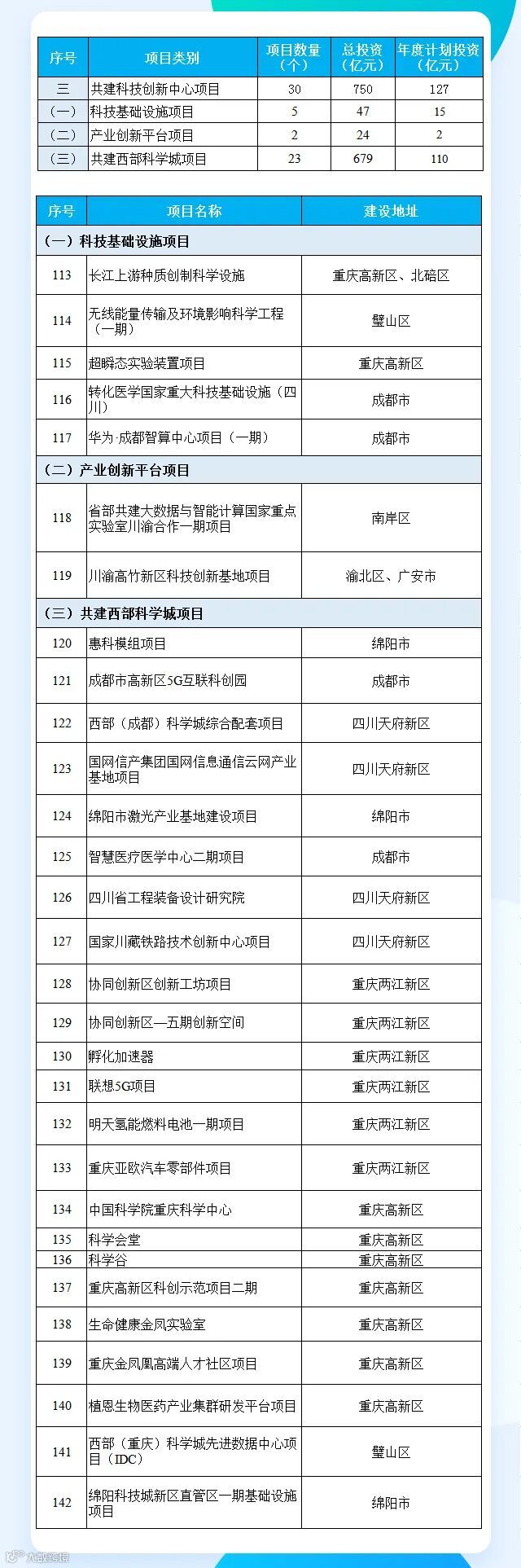 在共建科技创新中心方面:加快布局建设重大科技基础设施,积极构建产业创新平台,着力优化创新空间布局,合作共建西部科学城。共涉及项目30个、总投资约750亿元,包括超瞬态实验装置、转化医学国家重大科技基础设施(四川)、国家川藏铁路技术创新中心、生命健康金凤实验室等项目。