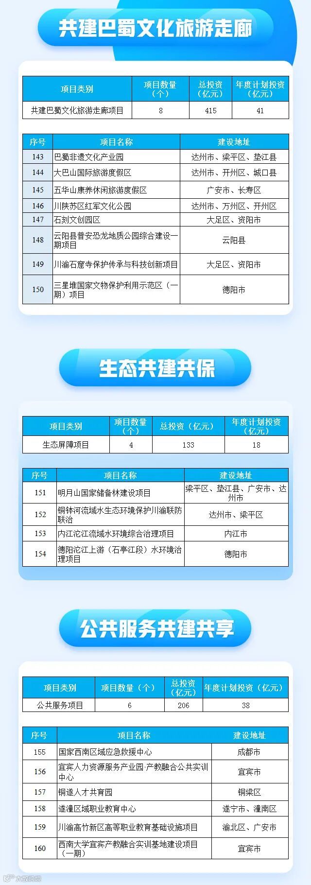共建巴蜀文化旅游走廊、生态屏障、公共服务等方面:涉及项目共18个,分别涉及总投资415亿元、133亿元、206亿元。