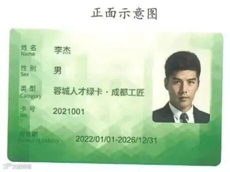 “蓉城人才绿卡”整体以绿色为基调,印制持卡人姓名、性别、类型和卡号,以及“成都工匠”本人照片。领到“绿卡”后,成都工匠将可以在成都市享品卡享受医疗、交通、保险保障、文体娱乐等服务保障。