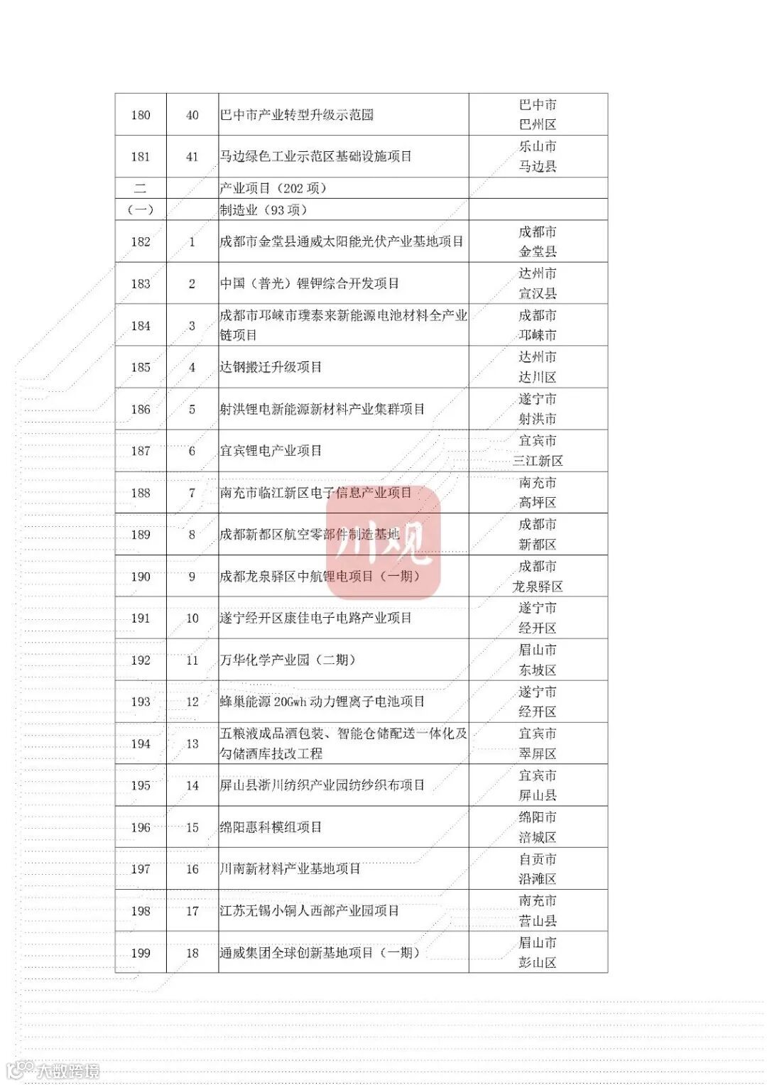 其中,产业项目数量位居最多,为327个,包括恒力(泸州)功能性纤维新材料项目、眉山市杉杉年产20万吨锂离子电池负极材料项目等。基础设施项目位居次席,达269个,重点涵盖G4216线仁寿至攀枝花高速公路、亭子口灌区一期工程等。而民生工程及社会事业项目和生态建设及环境保护项目则分别为78个、26个。