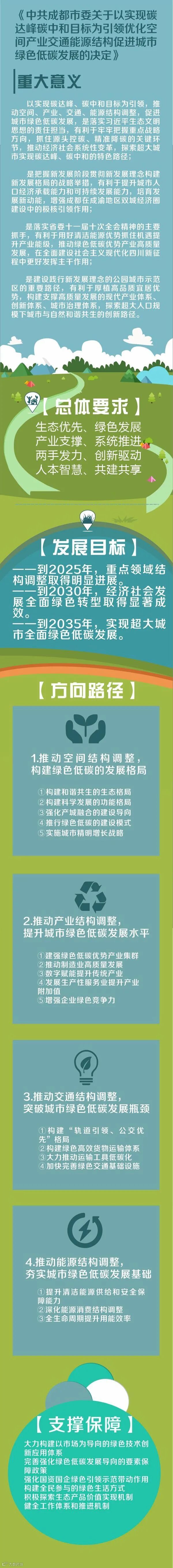 12月28日,中共成都市委十三届十次全会暨市委经济工作会议审议通过《中共成都市委关于以实现碳达峰碳中和目标为引领优化空间产业交通能源结构促进城市绿色低碳发展的决定》(以下简称《决定》),明确将以实现碳达峰、碳中和目标为引领,抓住关键源头,全方位优化空间、产业、交通和能源结构,建设人与自然和谐共生的现代化,走出一条绿色成为普遍形态的更高质量、更有效率、更加公平、更可持续的超大城市高质量发展新路径,加快建设践行新发展理念的公园城市示范区。