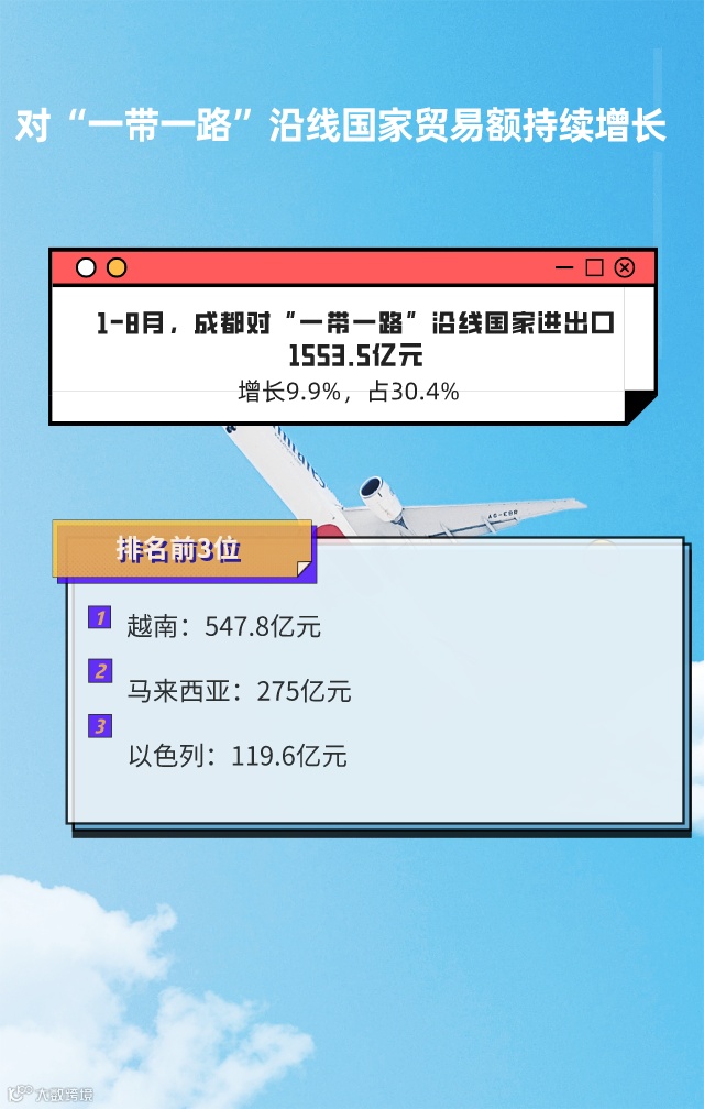 据海关统计,前8月成都对“一带一路”沿线国家进出口1553.5亿元,同比增长9.9%,占同期成都外贸进出口总值的30.4%,其中进出口值排名前3的分别为越南(547.8亿元)、马来西亚(275亿元)、以色列(119.6亿元)。