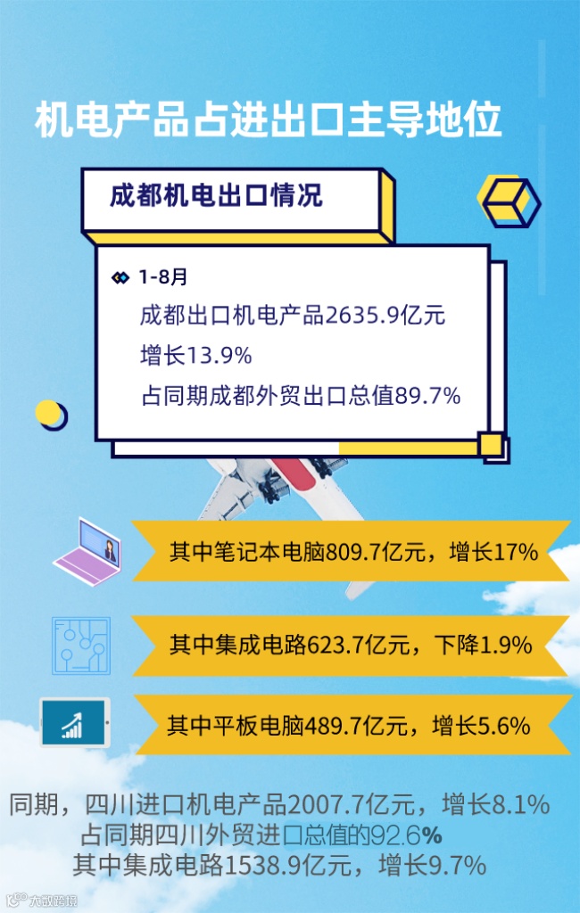 前8月,成都出口机电产品2635.9亿元,同比增长13.9%,占同期成都外贸出口总值的89.7%,其中笔记本电脑809.7亿元,同比增长17%;集成电路623.7亿元,下降1.9%;平板电脑489.7亿元,同比增长5.6%。此外,出口劳动密集型137.5亿元,同比增长36.4%;农产品15.2亿元,同比增长23.1%。同期,四川进口机电产品2007.7亿元,同比增长8.1%,占同期四川外贸进口总值的92.6%,其中集成电路1538.9亿元,同比增长9.7%。