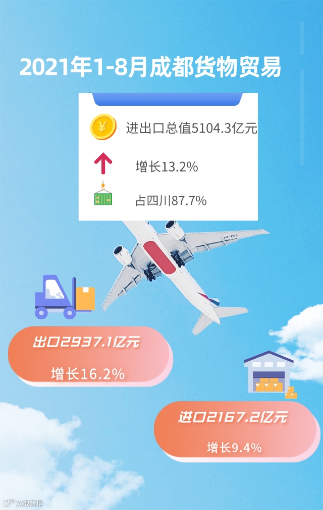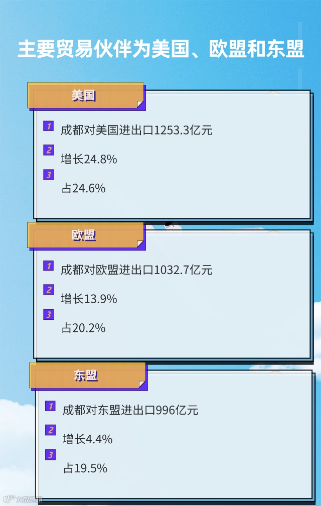 今年前8月,成都对美国进出口1253.3亿元,同比增长24.8%,占24.6%;对欧盟进出口1032.7亿元,同比增长13.9%,占20.2%;对东盟进出口996亿元,同比增长4.4%,占19.5%。