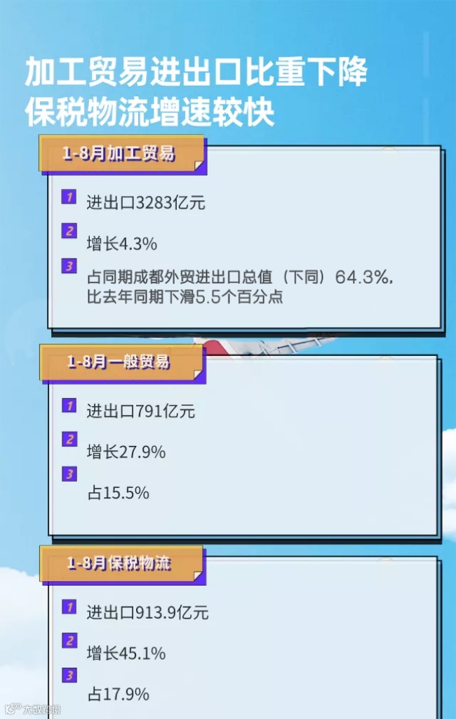 今年前8月,成都以加工贸易方式进出口3283亿元,同比增长4.3%,占同期成都外贸进出口总值的64.3%,比去年同期下滑5.5个百分点。而同期,一般贸易方式进出口791亿元,同比增长27.9%;以保税物流方式进出口913.9亿元,同比增长45.1%。