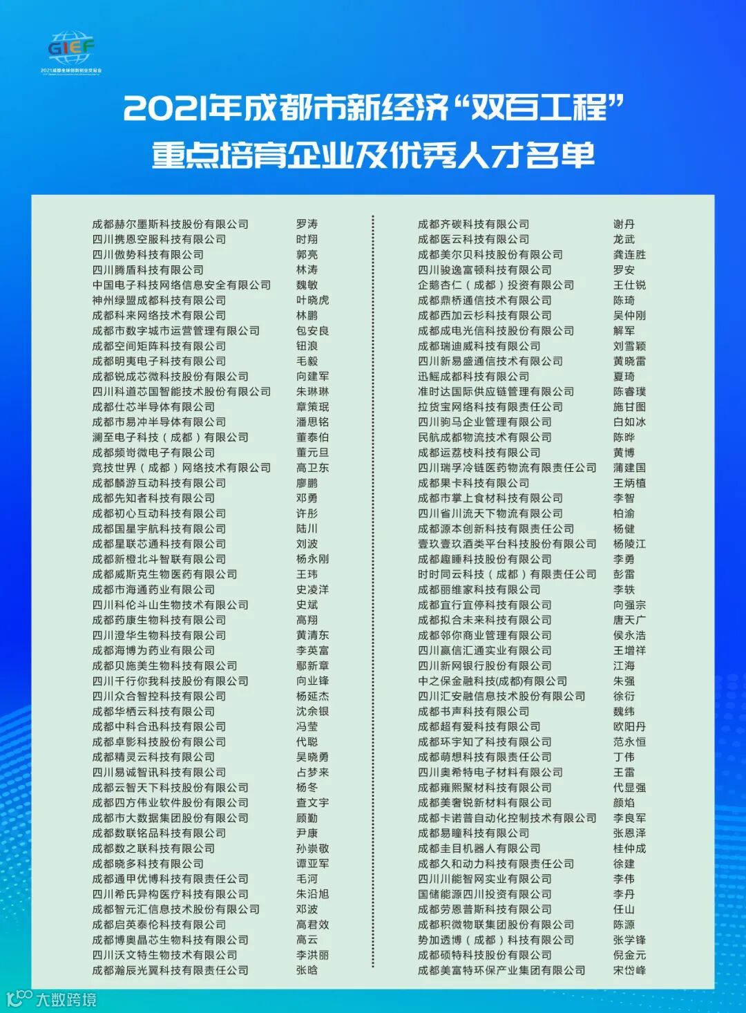 ↑2021年成都市新经济“双百工程”重点培育企业及优秀人才名单发布