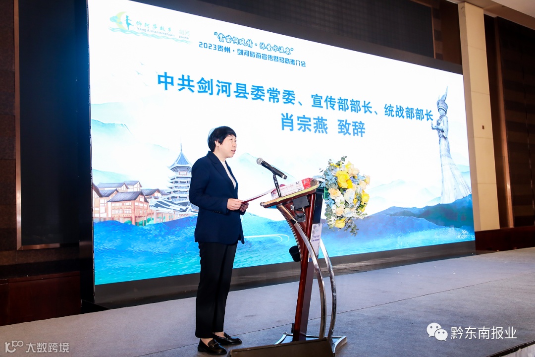 推介会上,播放了《剑河县旅游宣传片》生动全面地展示了剑河丰富的民族文化和自然生态景观等旅游资源。肖宗燕代表剑河县委县政府作了热情洋溢致辞。“自顺德区与剑河县结成东西部协作‘对子’以来,剑河县始终围绕‘四新’主攻‘四化’,在旅游产业提质升级、两地人文和旅游事业交流上狠下功夫。今日之剑河,是旅游康养的天堂。这里空气清、美酒香、佳肴丰、节日隆。全县森林覆盖率达72.42%,空气负氧离子达1.7万个,是天然氧吧。这里四季锦绣,春赏繁花、夏避酷暑、秋游乡村、冬浴温泉。锡绣、红绣巧夺天工,飞歌、多声部情歌悠扬婉转,30个传统村落是“养生的天堂”“避世的净土”“人类最美的诗意栖息地”。