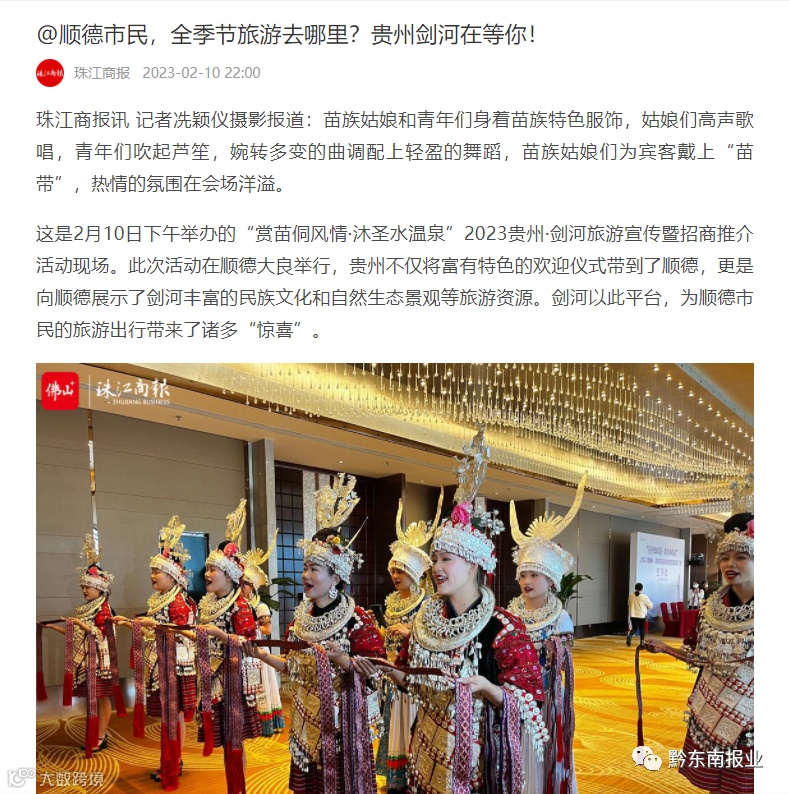 2月10日,在剑河苗族阿哥阿妹美丽动人的舞姿和热情洋溢的歌声中,以“赏苗侗风情•沐圣水温泉”为主题的2023贵州•剑河旅游宣传暨招商推介会拉开了帷幕。