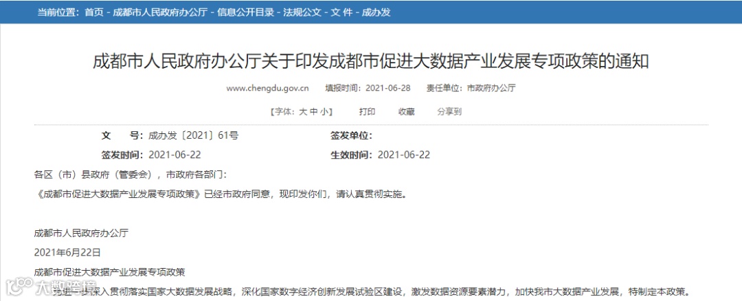 6月29日,从成都市人民政府网站获悉,《成都市促进大数据产业发展专项政策》(以下简称《专项政策》)已于日前出台。