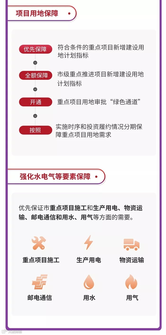 优先保障符合条件的重点项目新增建设用地计划指标,全额保障市级重点推进项目新增建设用地计划指标;开通市重点项目用地审批“绿色通道”。