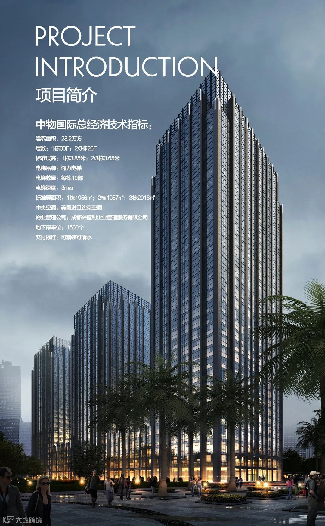 项目由3栋大楼组成,总建筑面积23万平方米,1栋高33层,2/3栋高26层。