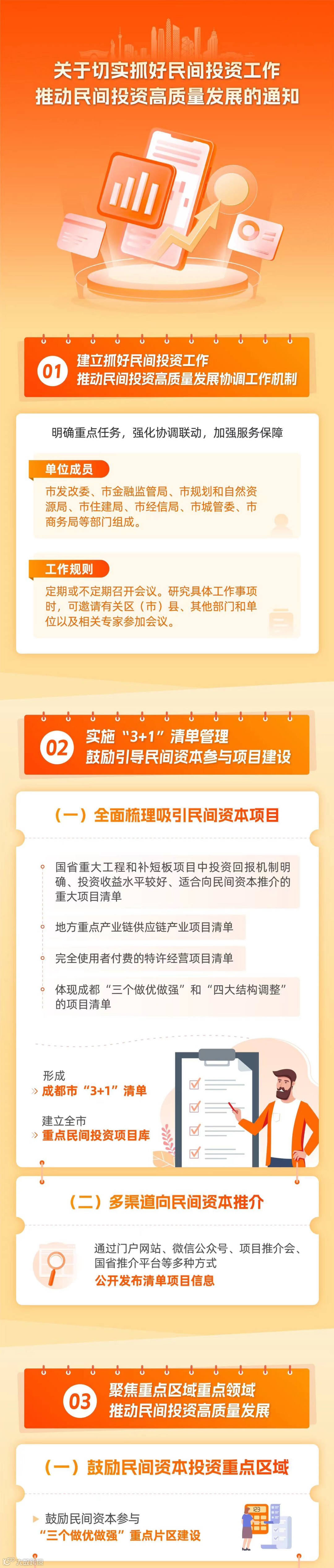 日前,为深入贯彻落实党中央、国务院关于推动经济运行整体转好、扩大有效投资、发展壮大民营经济系列决策部署,成都市发改委正式印发《成都市发展和改革委员会关于切实抓好民间投资工作推动民间投资高质量发展的通知》(成发改投资〔2023〕255号),从建立工作机制、实施清单管理、聚焦重点区域领域、健全保障机制、加强调度管理等5个方面提出14项工作举措,持续增强民间投资意愿和能力,努力调动民间投资积极性,推动民间投资高质量发展。